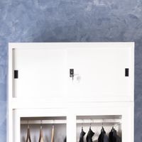 Full height sliding door wardrobe with 1 hanging rod and 2 adjustable shelves and keylock. Creative look with Ixy graphic "All KIOSK Furniture products are made from rust-proofed and powder-coated steel. The structure comes with a 6-year warranty. (It is strictly forbidden to remove the warranty sticker. If the sticker is removed, the warranty will be immediately voided.)"