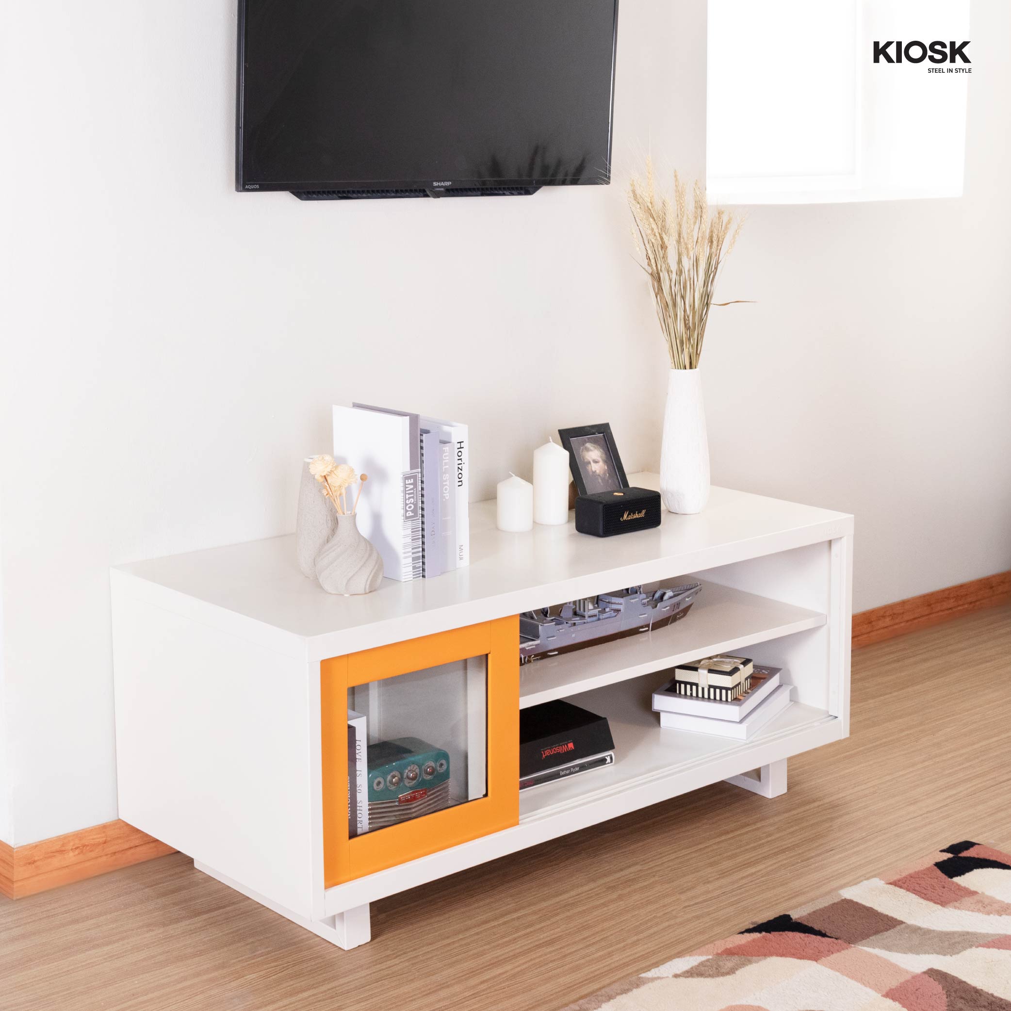 TV stand with shelf and sliding glass door. Available for big sized TV. Cable hole on back.