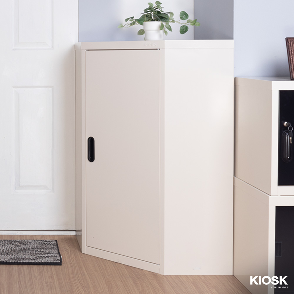 Half height Open steel door corner cabinet with 2 adjustable shelves and graphic available. loading capability  up to 50 kgs. per each shelf "All KIOSK Furniture products are made from rust-proofed and powder-coated steel. The structure comes with a 6-year warranty. (It is strictly forbidden to remove the warranty sticker. If the sticker is removed, the warranty will be immediately voided.)"