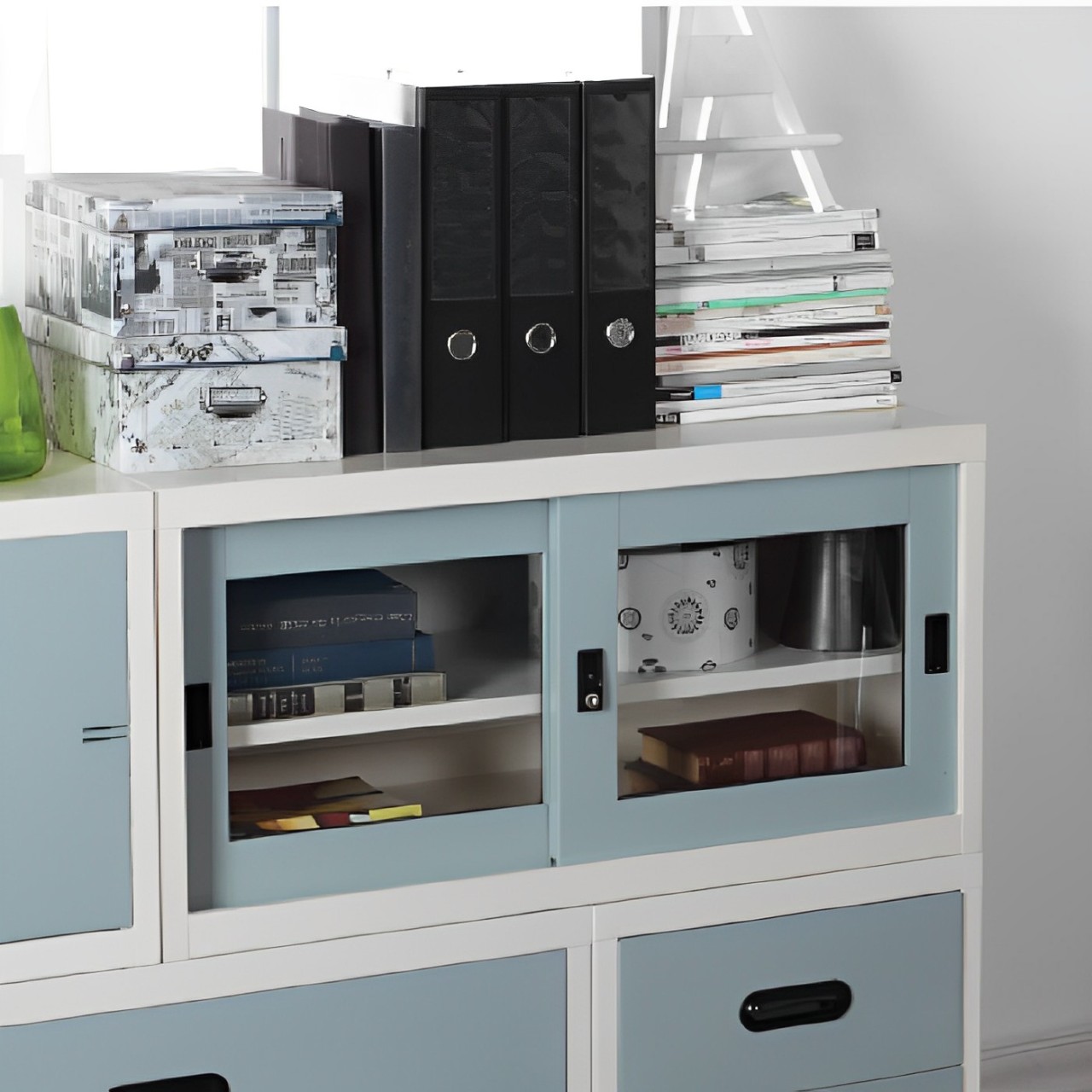 Uni-box 2 drawers with ball bearing runner system. Sliding glass door cabinet with 1 removable shelf and keylock.